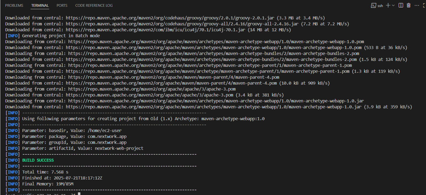 Using VS Code's Remote-SSH extension, I connected to my EC2 instance and created a Maven-generated Java web app. The project structure with src and webapp folders felt like magic - Maven had done all the heavy lifting!