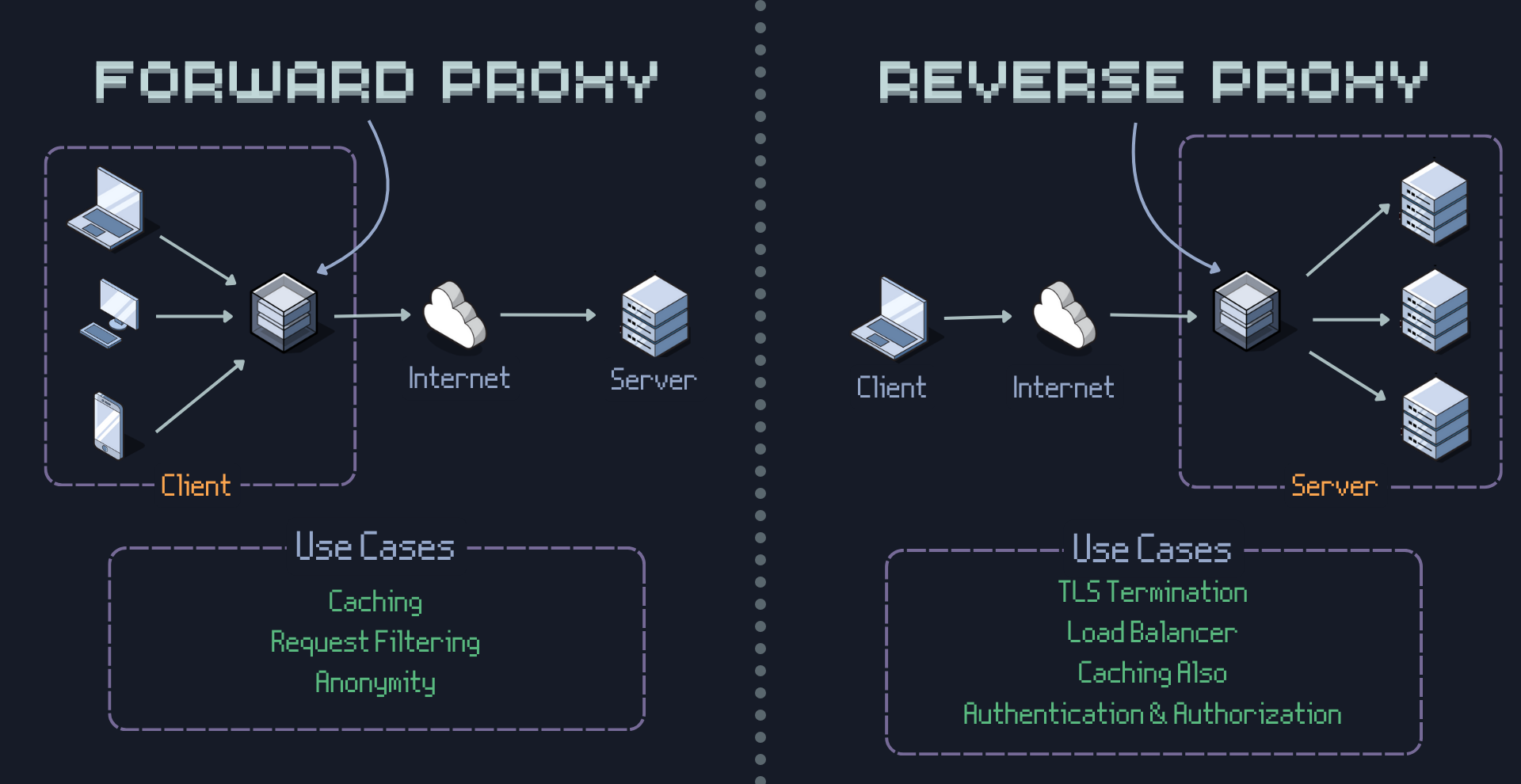 Forward proxy acts as intermediary for client requests to any server, providing anonymity and access control for internal users. Reverse proxy sits in front of servers, handling client requests by forwarding to appropriate server based on rules. It provides load balancing, SSL termination, and caching for improved performance. Both of these can be implemented using Nginx or Apache servers.