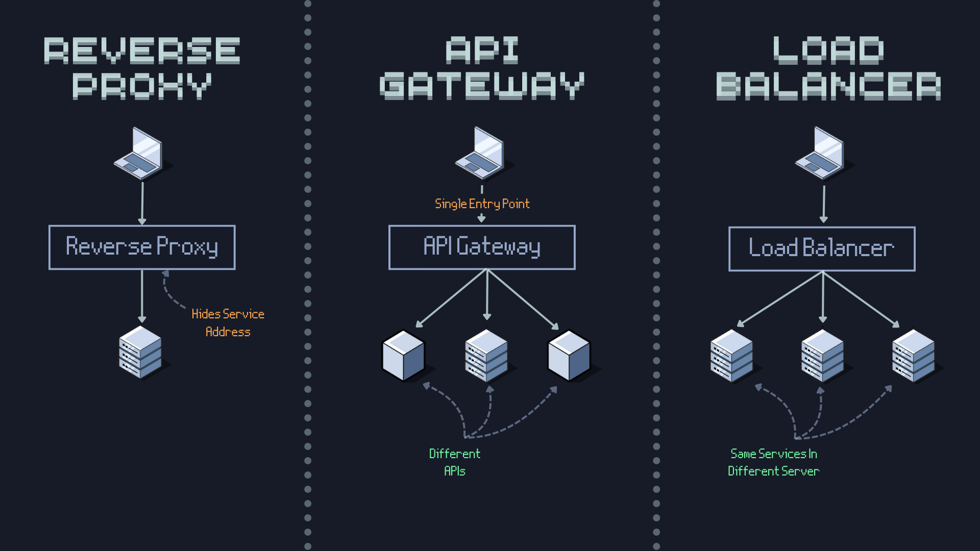 A Reverse Proxy primarily forwards client requests to backend servers, providing load balancing, SSL termination, and caching. An API Gateway is a specialized reverse proxy that manages API requests, offering features like request routing, rate limiting, authentication, and analytics. A Load Balancer distributes incoming network traffic across multiple servers to ensure high availability and reliability of applications. While all three can distribute traffic, the API Gateway focuses on API management, the Load Balancer on traffic distribution, and the Reverse Proxy on general request forwarding and optimization.