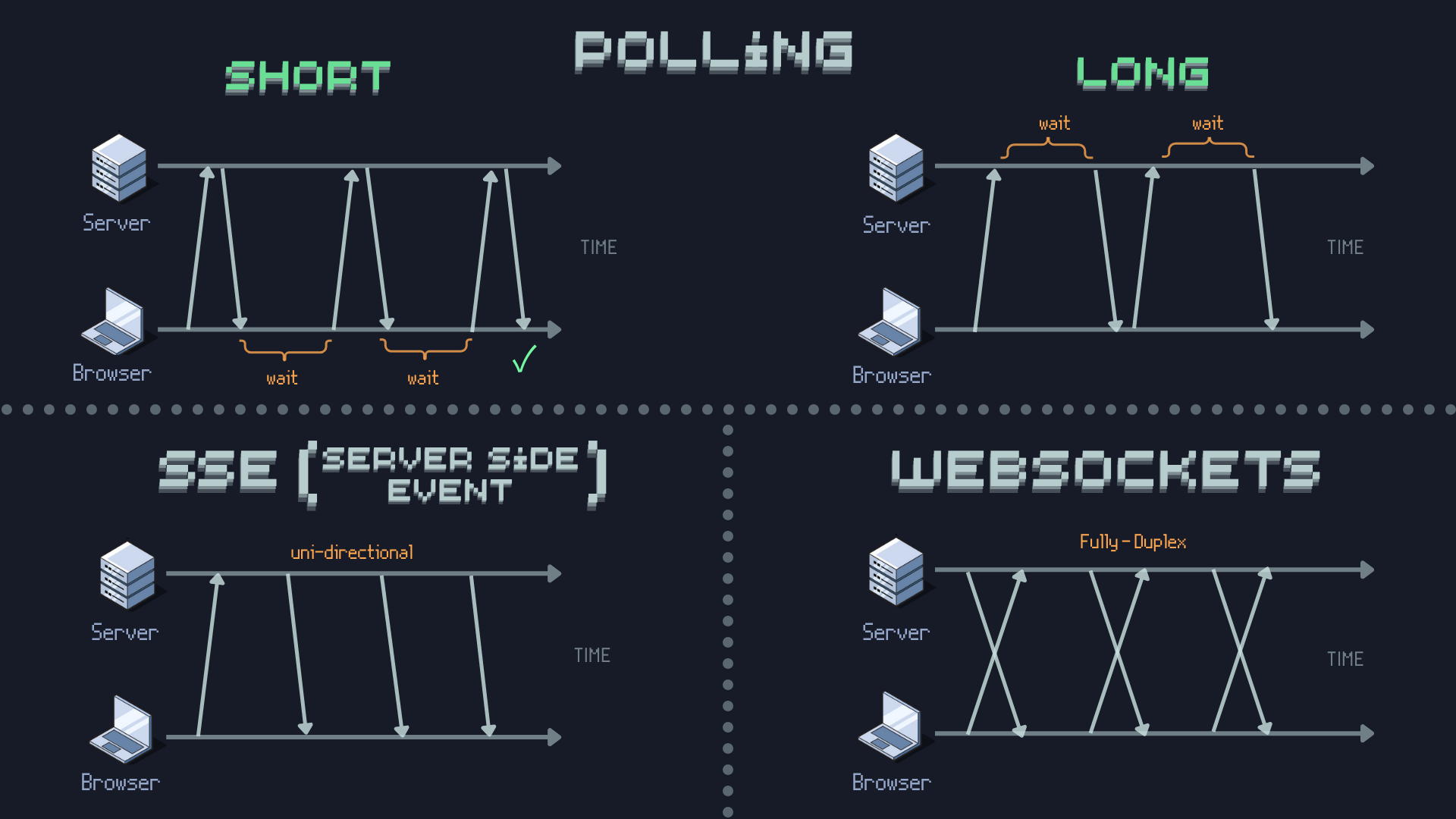 - Polling: Client periodically requests server for updates, leading to high traffic and latency.