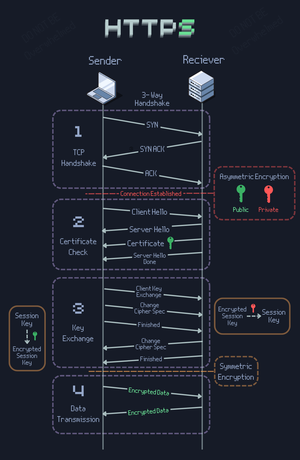 HTTPS has two extra steps included from normal http, as any person intercepting the network can read the data easily (Also Called as Man-In-The-Middle Attacks). The Two steps are: