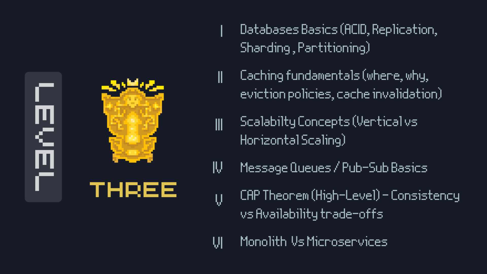 Level 3 introduces the core building blocks of scalable systems. Here we explore data storage strategies, caching mechanisms, and communication patterns that enable applications to handle millions of users. These concepts bridge the gap between basic networking knowledge and advanced architectural patterns. Understanding these fundamentals is crucial before diving into complex distributed system designs.