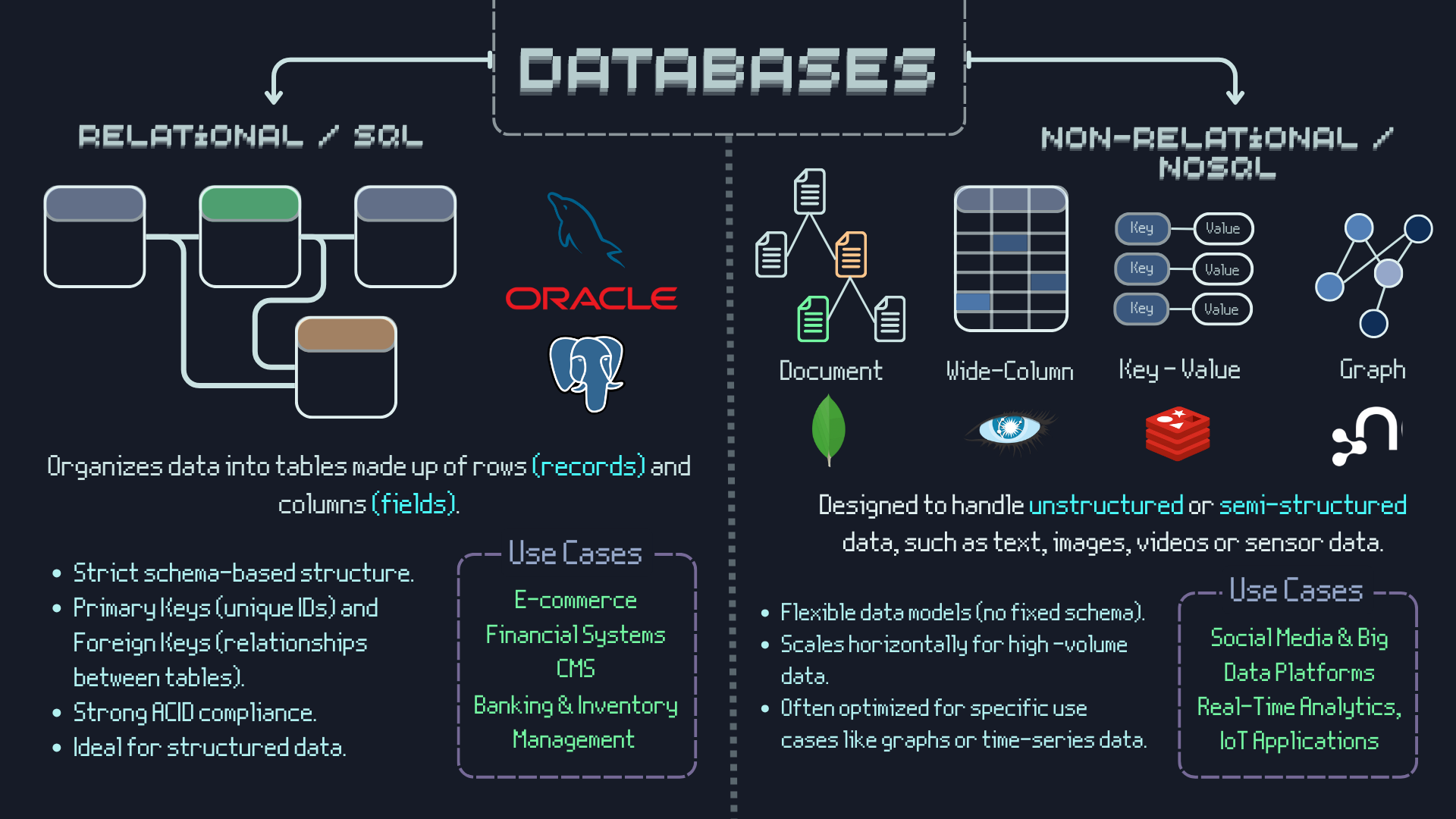 Relational databases (RDBMS) like MySQL and PostgreSQL provide ACID properties , structured schemas, and complex querying capabilities through SQL. Now what is ACID?