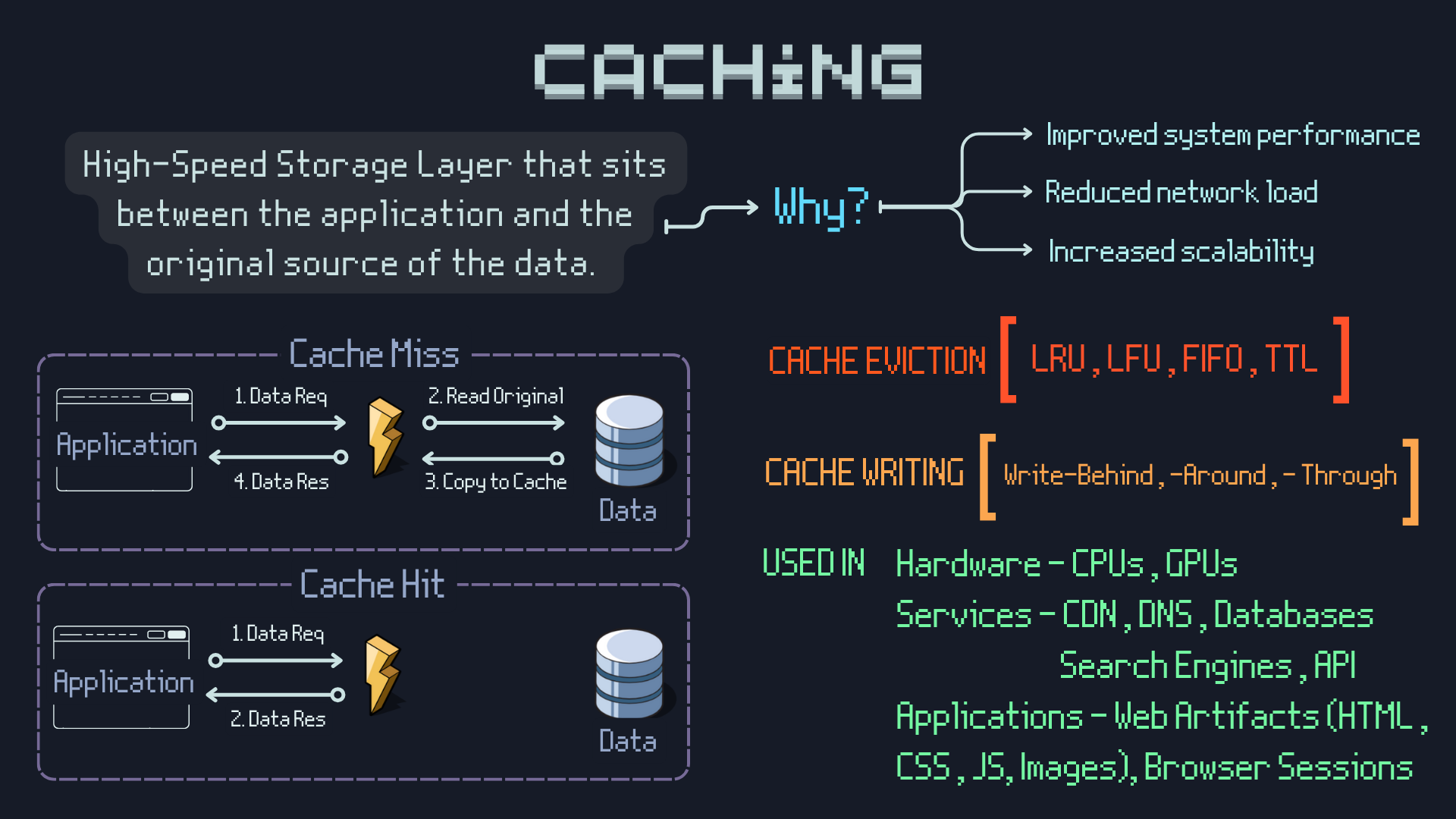 Caching stores frequently accessed data in fast storage to reduce latency and database load. Browser cache stores static assets locally. CDN cache distributes content globally. Application cache (Redis, Memcached) stores computed results. Database cache speeds up query results. Cache-aside (lazy loading) loads data on cache miss. Write-through updates cache and database simultaneously. Write-behind (write-back) updates cache immediately, database asynchronously. Cache eviction policies include LRU (Least Recently Used), LFU (Least Frequently Used), FIFO (First In First Out), and TTL (Time To Live) for automatic expiration.