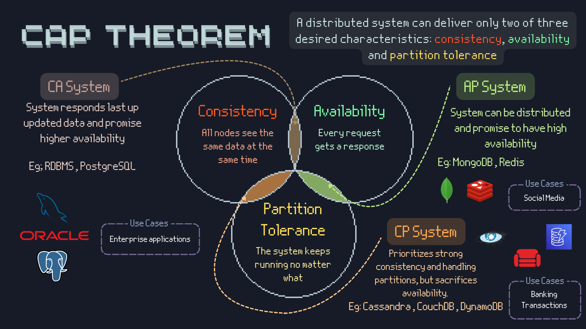 CAP Theorem states that distributed systems can only guarantee two of three properties: Consistency (all nodes see the same data simultaneously), Availability (system remains operational), and Partition tolerance (system continues despite network failures). CP systems (like MongoDB) prioritize consistency and partition tolerance, sacrificing availability during network issues. AP systems (like Cassandra) maintain availability and partition tolerance but may serve stale data. CA systems work only in single-node scenarios since network partitions are inevitable in distributed systems.