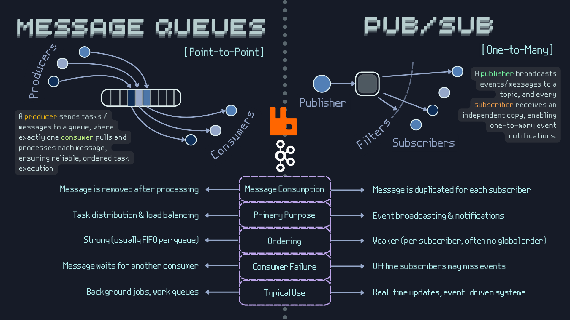 Message queues enable asynchronous communication between services, improving system resilience and scalability. Point-to-point queues deliver messages to single consumers (RabbitMQ, Amazon SQS). Publish-Subscribe patterns broadcast messages to multiple subscribers (Apache Kafka, Redis Pub/Sub). Use cases include order processing, email notifications, log aggregation, and event-driven architectures. Benefits include decoupling services, handling traffic spikes, ensuring message delivery, and enabling microservices communication. Message brokers provide durability, routing, and delivery guarantees.