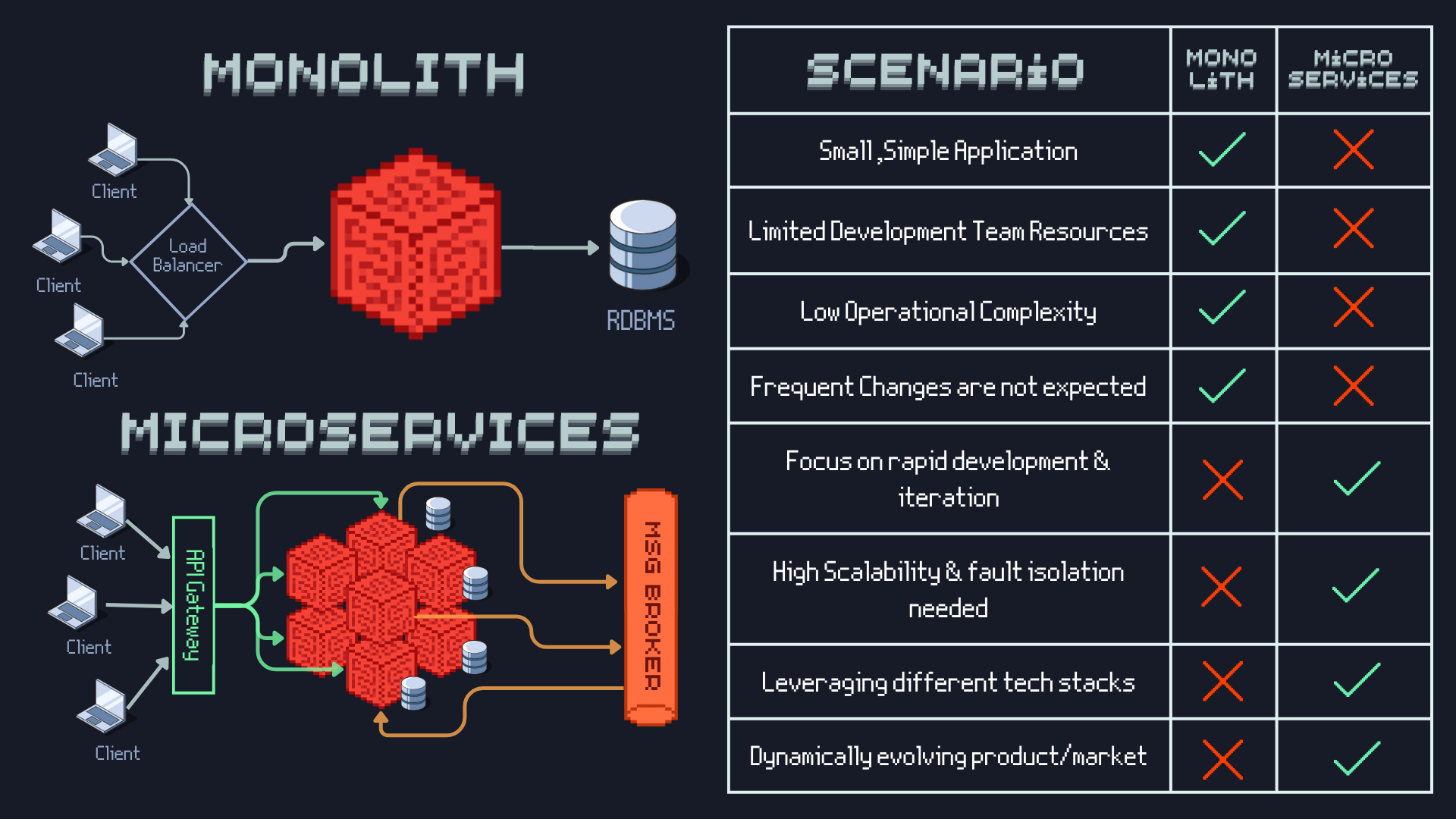 Monolithic architecture deploys entire application as single unit. Benefits: simple development, testing, and deployment; better performance due to in-process calls; easier debugging. Drawbacks: technology lock-in, scaling entire app for one component, single point of failure. Microservices architecture splits application into independent services. Benefits: technology diversity, independent scaling and deployment, fault isolation, team autonomy. Drawbacks: network complexity, distributed system challenges, operational overhead, eventual consistency issues. Choose monolith for simple applications and small teams; microservices for complex, large-scale systems with multiple teams.