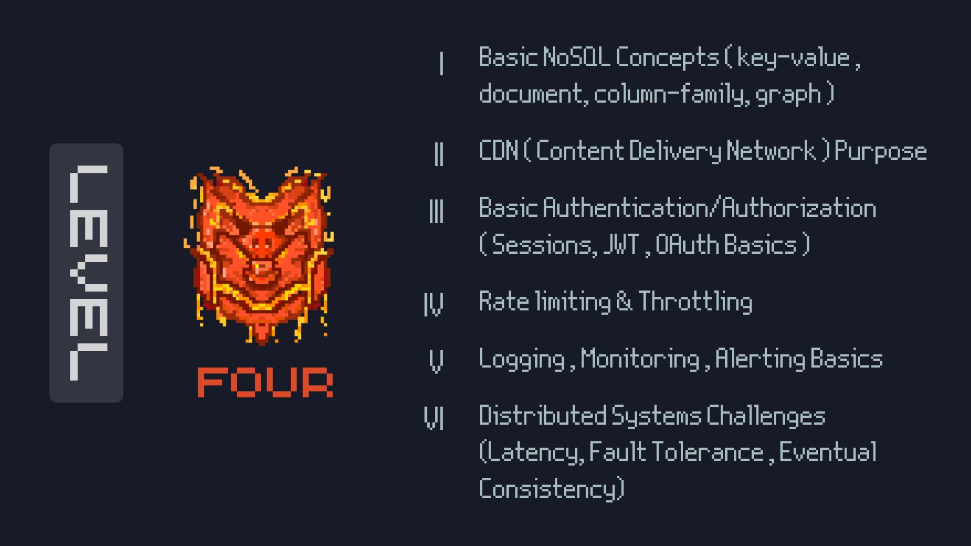 Level 4 covers advanced system design patterns and security considerations essential for production systems. These concepts focus on performance optimization, security, and operational excellence. Topics include global content distribution, traffic management, and robust authentication mechanisms. Mastering these areas enables you to design systems that can handle enterprise-scale requirements while maintaining security and performance standards.