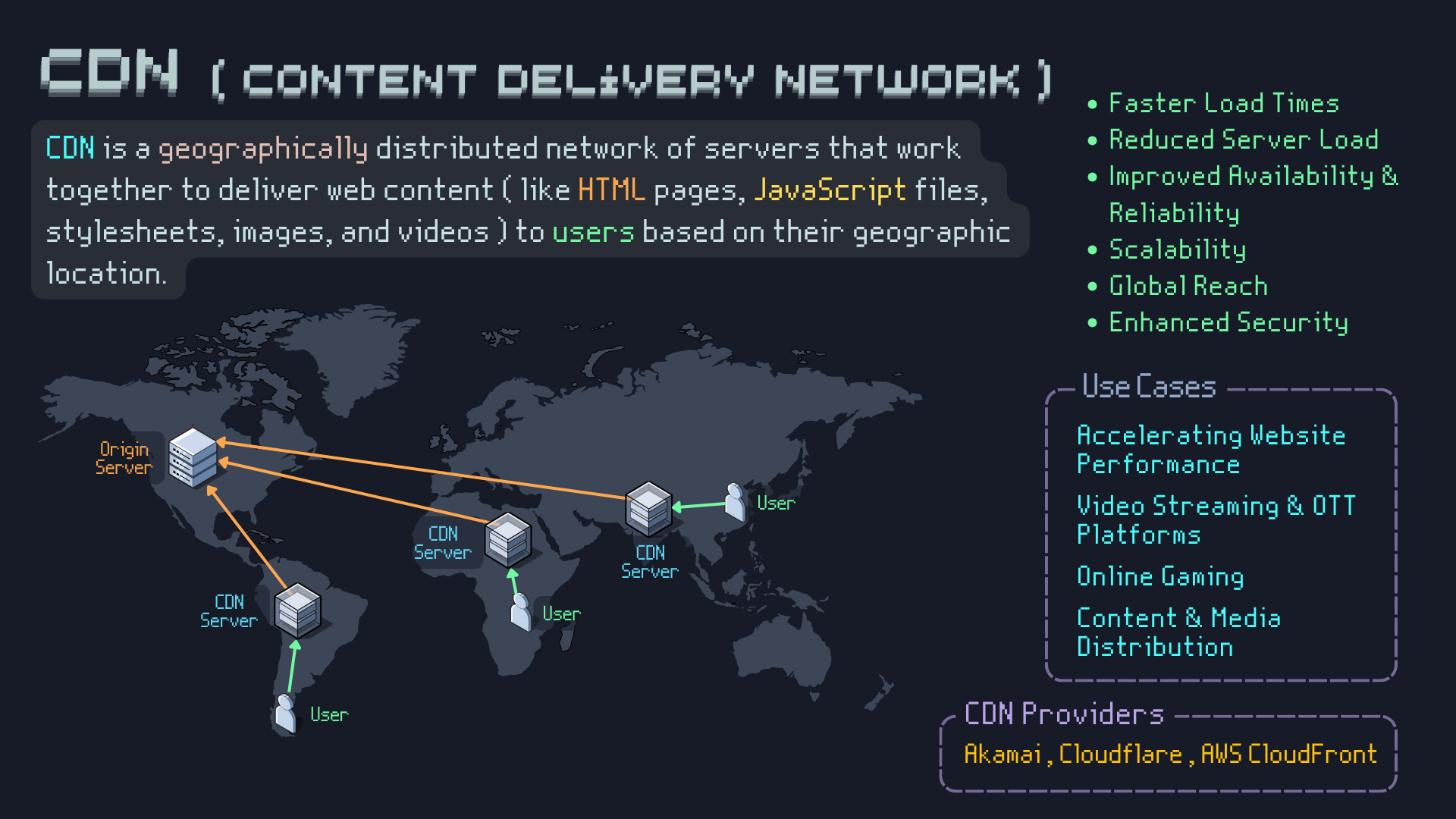 CDNs distribute content across geographically dispersed servers to reduce latency and improve user experience. Edge servers cache static assets (images, CSS, JavaScript) closer to users. Benefits include faster load times, reduced origin server load, improved availability, and DDoS protection. CDNs use techniques like geographic routing, caching policies, and content optimization. Popular CDNs include CloudFlare, Amazon CloudFront, and Akamai. CDNs are essential for global applications, media streaming, and e-commerce platforms where performance directly impacts user engagement and revenue.