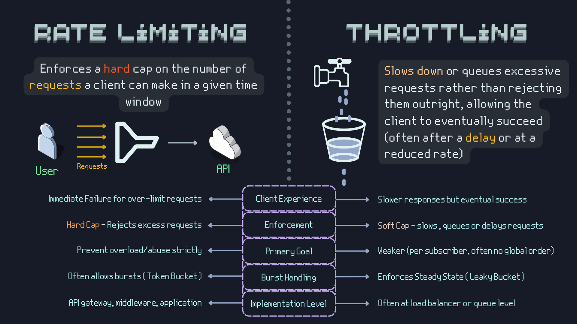 Rate limiting controls the number of requests a client can make within a time window, preventing abuse and ensuring fair resource usage. Common algorithms include Token Bucket (allows bursts), Leaky Bucket (smooth rate), Fixed Window (simple but allows spikes), and Sliding Window (more accurate). Throttling gradually reduces service quality under load. Implementation can be at API gateway, application level, or infrastructure level. Rate limiting protects against DDoS attacks, ensures SLA compliance, and prevents resource exhaustion. Consider user experience when implementing - provide clear error messages and retry guidance.