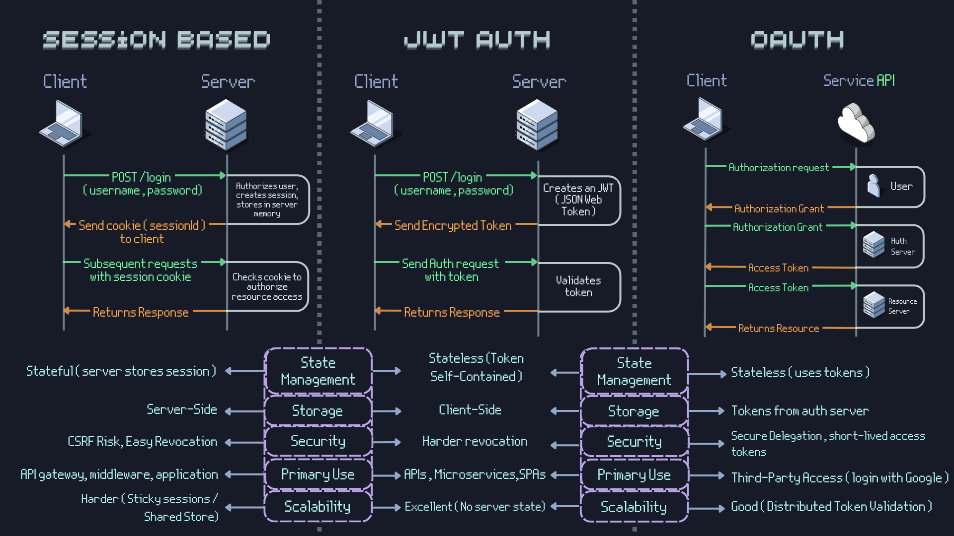 Authentication (AuthN) verifies user identity; Authorization (AuthZ) determines access permissions. Session-based authentication stores user state on server, uses cookies for client identification. Stateful but simple to implement and revoke. JWT (JSON Web Tokens) are stateless, self-contained tokens with encoded user information and expiration. Scalable but harder to revoke. OAuth 2.0 enables third-party authentication (Google, Facebook login) without sharing credentials. Provides scoped access and refresh tokens. Choose session-based for simple applications, JWT for distributed systems, OAuth for third-party integrations. Always use HTTPS and implement proper token storage and rotation.